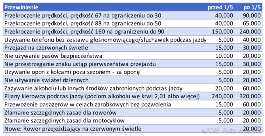 Z dniem pierwszego maja weszły w życie podwyżki za przekroczenie prędkości, spożywanie alkoholu podczas jazdy, używanie telefonu podczas prowadzenia pojazdu i inne. Podwyżki przedstawiono w formie tabelki którą postanowiłam dla Was przetłumaczyć na język polski.